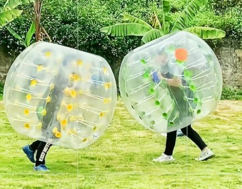 游戏规则:场内选手进入特制的泡泡球内,进行有技巧的碰撞,选手身体的任何部位被撞出比赛区域,或者撞倒在地的马上淘汰。留在场上的选手为获胜方。